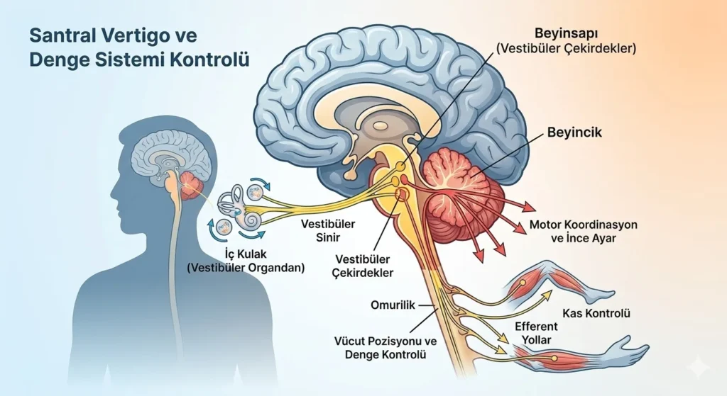 • Beyin Sapı (Brainstem): Vücuttan gelen denge sinyallerinin geçtiği ana otobandır. Buradaki bir tıkanıklık veya lezyon doğrudan vertigoya yol açar.